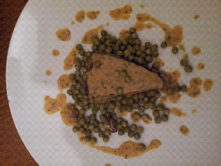 - Coloquem as ervilhas previamente escorridas na mesma frigideira e desliguem o lume.